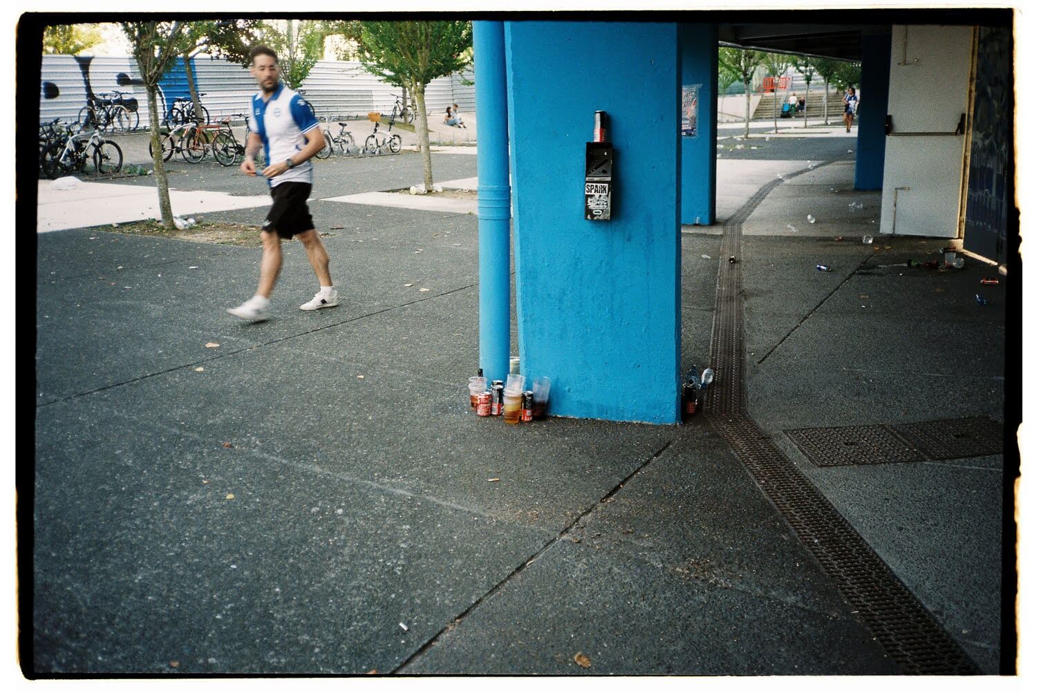 まず、青い柱の下に秩序立てて集まっているような、飲みかけの缶ビールやジュースのコップが目に入ってきた。